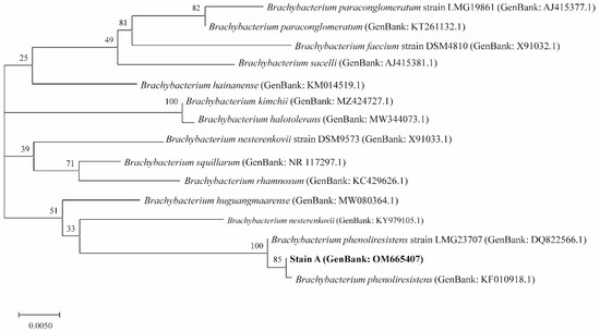 Based on the analysis, strain A was preliminarily considered to be a Brachybacterium strain, probably a strain of B. phenoliresistens. Hence, strain A is denoted Brachybacterium sp. MO. Strain B belongs to the Microbacterium genus. However, strain B has yet to be identified by multiphase classification and identification, so it is denoted as Microbacterium sp.
