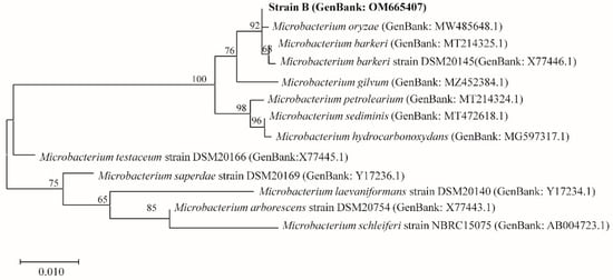 Molecular phylogenetic analysis of strain B (Microbacterium sp.) using the maximum likelihood method.