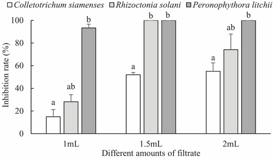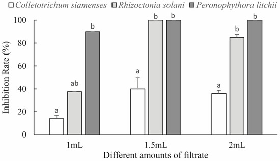 Inhibitory effect of Microbacterium sp. against three plant pathogens with different amounts of filtrate. For each amount of filtrate, bars with the same letter are not significantly different (p > 0.05, Mann–Whitney U test).
