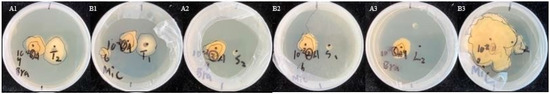 On the bacterial plate, the growth of the pathogen was almost unaffected by live B. phenoliresistens MO and Microbacterium sp., which was consistent with the results obtained from the fermentation broth inhibition experiment. P. litchii growth was significantly inhibited by strains A and B. Mycelial growth around live strain B was relatively unaffected, while germination could not occur around live strain A, as shown in Figure 6.