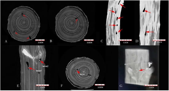 CT scanning images of Pinus densiflora segments ((A,B) are on the transverse plane, (C,D) are on the longitudinal plane, and (E–G) are Monochamus alternatus larvae (red arrow)).