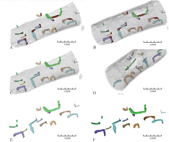Using the CT scanning images, the galleries in wood segments were selected, segmented, and saved, then the reconstruction data of corresponding galleries were obtained. The reconstruction models and data of 43 complete galleries were obtained from five wood segments of P. densiflora. As shown in Figure 2, Figure 2A–D shows views of the galleries in an entire wood segment. The relative spatial position of the galleries in the wood segment is clear. The brown parts in Figure 2 are the blocked parts of the galleries. Figure 2E,F shows the reconstructed galleries, and the shapes and number of galleries were clear. Each reconstructed gallery image was obtained by adjusting the transparency of the whole section or hiding the wood segments.