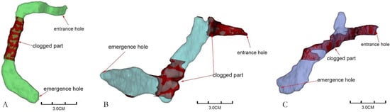 The reconstructed gallery images showed that each gallery was separate, and most were C-shaped (83.72%) (Figure 3A), while the remaining galleries were either S-shaped (6.97%) (Figure 3B) or Y-shaped (9.3%) (Figure 3C), as shown in Figure 3, which indicated that the shape of M. alternatus galleries was simple. Only one larva was found in each gallery and did not collude with each other. The three kinds of galleries were curved near the entrance holes, and at the end of the galleries were the pupal chambers, which were significantly larger than the entrance holes. The entrance holes and emergence holes of C-shaped and Y-shaped galleries were at the same end, while those of S-shaped galleries were at opposite ends. The three gallery types were all blocked by the frass–feces mixture near the entrance holes and in the anterior parts of the pupal chambers. It could be seen that the larvae pushed out the mixture during feeding, and it was left in the galleries after pupation.
