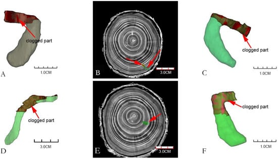 Blocked parts of Monochamus alternatus galleries. ((A,C,F): the blocked parts of C-shaped are at the beginning of the galleries; (D): the blocked part of S-shaped is located in the middle of the gallery. (B,E): the images of the transverse section of the CT images of the galleries, note the degree of blockage of the galleries by frass–feces mixture (red arrow), the blocked part of the gallery (indicated by green), the unblocked part of the gallery (indicated by yellow)).