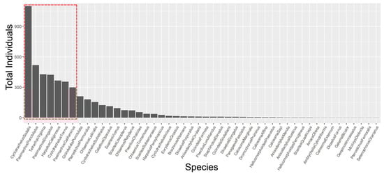 Figure 2. Rank abundance of all 48 restored grassland carabid beetle species from highest to lowest abundance. Seven species (red box) represent 68% of all carabids collected across 108 sites in 2017 and 2018.