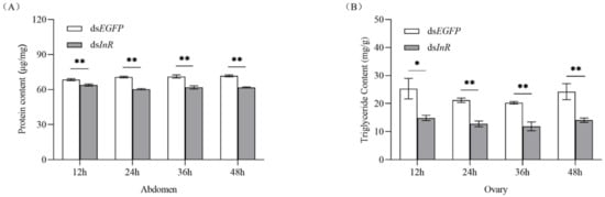 3.4. Effect of SlInR Knockdown on Protein and Triglyceride (TAG) Metabolism