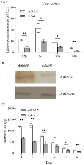 3.5. Effect of SlInR Silence on SlVg Expression and Reproduction