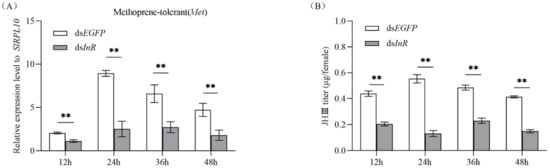 3.6. Effect of SlInR Interference on SlMet Expression and JH-III titer