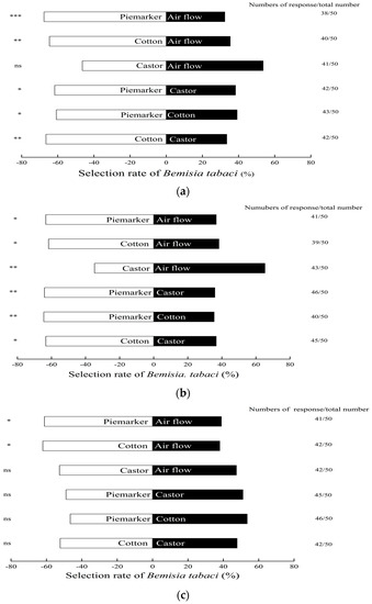 The B. tabaci adults had no significant preference to the volatiles between piemarker (48.9%) and castor plants (51.1%, χ2 = 0.02, p > 0.05), and between piemarker (46.5%) and cotton plants (53.5%, χ2 = 0.36, p > 0.05), as well as between cotton (52.2%) and castor (47.8%, χ2 = 0.12, p > 0.05) (Figure 1c).