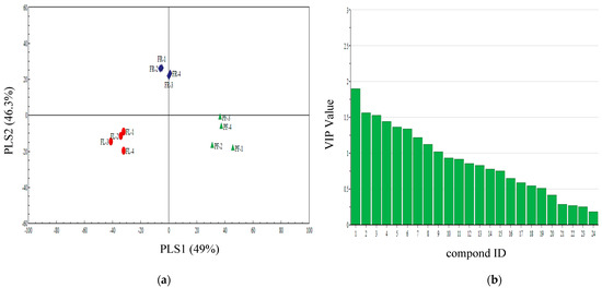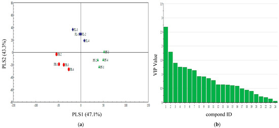 (a) Partial least squares discriminant analysis (PLS-DA) of pre-flowering (PF), florescence (FL), and fruiting (FR) of piemarker plant volatile compounds. The score plot display the grouping pattern according to the first two components and the ellipse defines the Hotelling’s T2 confidence interval (95%) for the observations. (b) VIP value of piemarker plant volatile compounds. Compounds ID: (1) linalool, (2) nonane, (3) ethyl octanoate, (4) ethyl nonanoate, (5) butyl acrylate, (6) 1,3,7-ocimene, (7) 3-hexadecanol, (8) ethyl decanoate, (9) decane, (10) octanal, (11) 2-ethyl hexanol, (12) 2-butyl-1-octanol, (13) naphthalene, (14) di-n-butyl ether, (15) nonanal, (16) Decanal, (17) 6-methyl-5-hepten-2-one, (18) α-caryophyllene, (19) 1-hexanol, (20) 2-ethylhexyl acrylate, (21) ethylbenzene, (22) methyl benzoate, (23) dodecyl aldehyde, and (24) 3-hexadecanol.