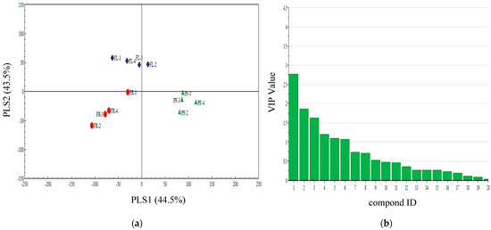 (a) Partial least squares discriminant analysis (PLS-DA) of pre-flowering (PF), florescence (FL), and fruiting (FR) of castor plant volatile compounds. The score plot display the grouping pattern according to the first two components and the ellipse defines the Hotelling’s T2 confidence interval (95%) for the observations. (b) VIP value of castor plant volatile compounds. Compounds ID: (1) nonanal, (2) ethyl decanote, (3) 1-octanol,2-butyl-, (4) butyl acrylate, (5) 3-hexadecanol, (6) naphthalene, (7) ethylbenzene, (8) 3,7-dimethyl-1,3,6-octatriene, (9) decanal, (10) butyl acetate, (11) dodecyl aldehyde, (12) 1,3-xylene, (13) d-longifolene, (14) 2-ethyl hexanol, (15) methyl benzoate, (16) (-)-thujopsene, (17) 6-methyl-5-hepten-2-one, (18) di-n-butyl ether, (19) Decane, (20) α-pinene.
