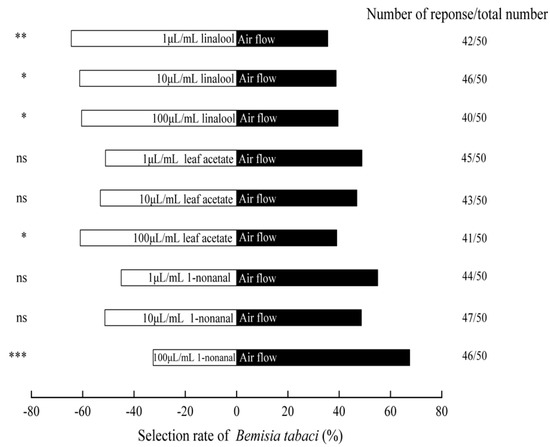 The Figure 5 showed that among the three compounds, the B. tabaci had clear preference to linalool. The linalool concentrations at 1, 10, and 100 μL/mL attracted 64.4% (χ2 = 7.72, p < 0.01), 61.2% (χ2 = 4.56, p < 0.05), and 60.4% (χ2 = 3.92, p < 0.05) adults, respectively. In addition, (Z)-3-hexenyl acetate was also significantly attractive to this pest at 100 μL/mL, and the selection rate was 60.9% (χ2 = 4.32, p < 0.05). However, there was no significant difference between air and 1 and 10 μL/mL (Z)-3-hexenyl acetate (χ2 = 0.02, p > 0.05; χ2 = 0.28, p > 0.05). At a concentration of 100 μL/mL, nonanal showed the obvious repellant effects against B. tabaci, and the selection rate was only 32.5% (χ2 = 11.56, p < 0.001). However, there was no significantly preference of adults to medium and low concentrations of nonanal (χ2 = 1.87, p > 0.05; χ2 = 0.02, p > 0.05).