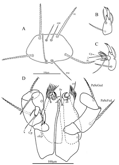 Gnathosoma. With one pair of nude galealae (cs), two pairs of nude hypostomalae (as and bs), hypostomal lip fimbriate (Figure 2D); bs much longer than as (Table 1). Dorsum of palpfemur and palpgenu each with one barbed and pointed seta (PaScFed and PaScGed), PaScFed longer than PaScGed; palptibia with three barbed setae, two on the venter, odontus bifid (Figure 2B–D). Palptarsus with eight setae including two barbed setae, four nude setae, one solenidion (ω), one eupathidium (ζ) and one Cp (Figure 2C), fPp = 0-B-B-3B2-2B4NωζCp. Palpal supracoxal seta (elcp) peg-like (Figure 2D).
