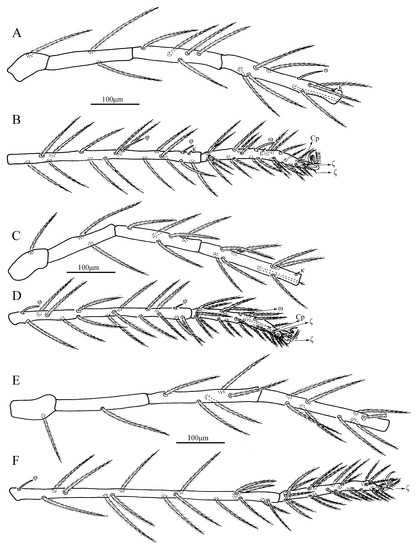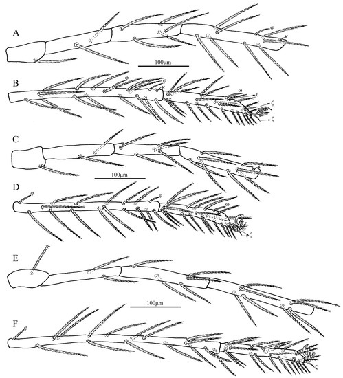 Eatoniana nanlingensissp. nov., larva. (A). Leg I, trochanter—genu. (B). Leg I, tibia—tarsus. (C). Leg II, trochanter—genu. (D). Leg II, tibia—tarsus. (E). Leg III, trochanter—genu. (F). Leg III, tibia—tarsus.