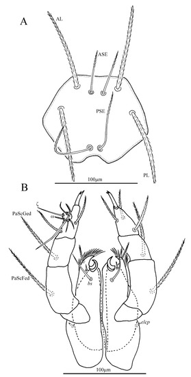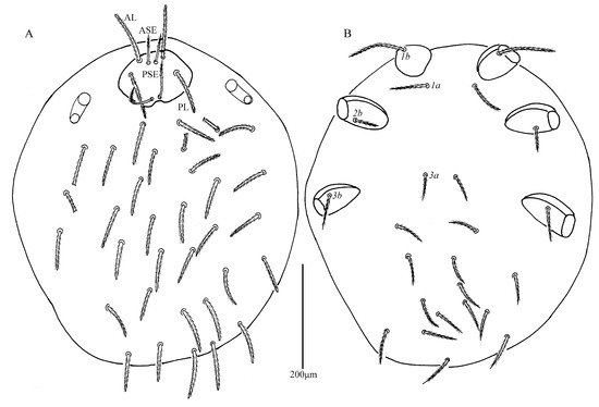 Description. Dorsum. Idiosoma almost oval, with 68 barbed setae (fD = 68 in paratype) (Figure 1A). Two pairs of eyes without platelets, posterolateral to scutum. Scutum about trapezoidal with rounded angles, anterior margin and lateral margin almost straight, posterior margin slightly cambered with small concave portion between bases of PSE (Figure 2A and Figure 3). Scutum with two pairs of entirely barbed sensilla (ASE and PSE) and scutalae (AL and PL). PSE much longer than ASE, AL slightly longer than PL (Table 1).