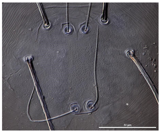 Description. Dorsum. Idiosoma almost oval or sub-circular, with 33 barbed setae (fD = 32–33 in paratypes) (Figure 5A). Two pairs of eyes present on platelets. Scutum is pentagonal, anterior margin and anterolateral margin almost straight and posterolateral margin is almost straight with visible concavity between the base of PSE (Figure 6A and Figure 7). Scutum with two pairs of sensilla (ASE and PSE) and scutalae (AL and PL). ASE and PSE with fine barbs on distal half, PSE much longer than ASE. AL longer than PL, both entirely barbed (Table 2).