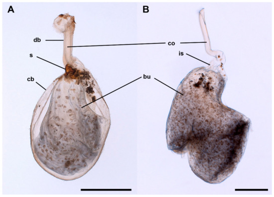 Bursa copulatrix of the butterfly L. aripa. (A) Cleared female abdomen showing the location and area occupied by the corpus bursae (cb), ductus bursae (db), ductus seminalis (ds), and signum (s). (B) Isolated CB of a virgin female. Figure 1B is a different photograph of the CB shown in Figure 1A in reference [2]. Scale bars: A = 1 mm, B = 200 µm.