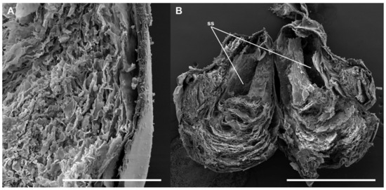 Inner structure of a spermatophore of L. aripa seen under the SEM. (A) Close-up of a portion of the wall of the spermatophore bulb showing a spongy material. (B) Inner structure of the spermatophore bulb and collum, showing the cavity in the posterior part of the bulb (called the sperm sac, ss) connected to the hollow duct and running along the collum. Scale bars: A = 200 µm, B = 1 mm.