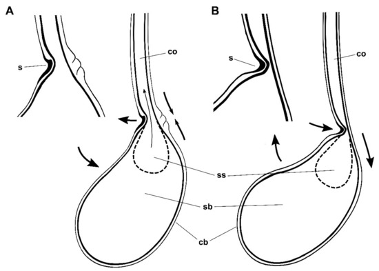 Hypothetical mechanism of the signum and associated muscles of female L. aripa. (A) Relaxed position. (B) Contracted position. When muscles contract, the cervix of the CB (cb) bends and the signum (s) presses the collum (co) with the protruding central part, and the deformation blocks the communication between the lumen of the collum and the sperm sac (ss). Note how this action bends the main axis of the bulb (sb) and the collum at an angle of approximately 45° and gives the base of the collum its curved shape.