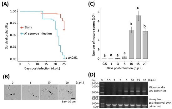 Observation and molecular identification of N. ceranae infection. (A) Kaplan–Meier survival curve (* = significant difference); (B) observation of mature spores; (C) mature spore counts (Different letters indicate significant differences (p < 0.05)); and (D) molecular detection of N. ceranae infection at 0.5 (12 h), 1, 3, 5, 10, 15, and 20 d.p.i.; d.p.i. = days post-infection; CD = cell debris; SP = spore; the arrowhead indicates the cell debris; the arrow indicates the spore.
