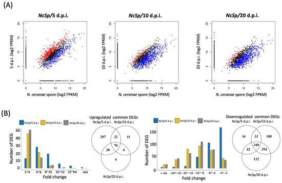 For the DEG analysis, a total of 878, 952, and 981 genes were identified to have significant fold changes (fold change ≥ 2 or ≤−2) in NcSp/5 d.p.i., NcSp/10 d.p.i., and NcSp/20 d.p.i., respectively. Among these DEGs, 429, 117, and 113 genes were upregulated and 449, 835, and 868 genes were downregulated in NcSp/5 d.p.i., NcSp/10 d.p.i., and NcSp/20 d.p.i., respectively (Figure 2A; Table 1, Table 2, and Tables S4–S9). The common DEGs were selected from all three groups of common DEGs by set intersection, and stage-specific genes were defined as the genes that were only expressed at 5, 10, and 20 d.p.i., respectively (Table 3 and Table S10). There was a total of 70 upregulated and 340 downregulated common DEGs (Figure 2B; Table 1, Table 2, and Tables S4–S9), and the fold-change distribution at each infection stage is shown in Figure 2B. The results also showed that a greater upregulation of N. ceranae common DEGs and stage-specific genes was found in the initial infectious stage, whereas more genes of N. ceranae were suppressed in the late stage of infection (Figure 2). For the stage-specific genes, a total of 25, 71, and 70 genes were identified at each time post-infection (Supplementary Table S10), and the top 10 expression values (FPKM) of the stage-specific genes are summarized in Table 3.