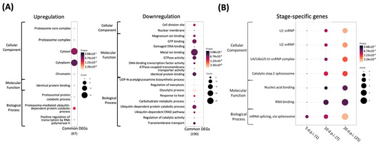 Dot plot of N. ceranae Gene Ontology (GO) term enrichment analysis, showing the enriched pathways with p < 0.05. (A) Core genes; (B) stage-specific genes. Each trial is indicated at the bottom; the total number of regulated genes within the GO pathways selected on the dot plot are indicated in brackets. Colors indicate the p values from Fisher’s exact test, and the dot size is proportional to the number of DEGs and common DEGs in the pathway.