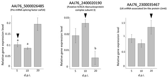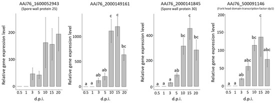For the stage-specific gene validations, the stage-specific genes were only expressed at specific times post-infection, while the gene expression of AAJ76_5000026485, AAJ76_2400020190, and AAJ76_2300035467 was detected at all times post-infection, including in mature spores (Figure 7). However, the results of three stage-specific genes showed higher expression levels at 5, 10, and 20 d.p.i., revealing a similar expression trend as the transcriptomic prediction (Figure 7).