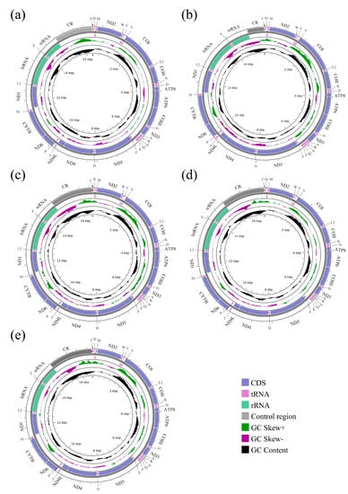 Multiple sequence alignments (MSAs) of all of the protein-coding and rRNA genes were obtained by aligning each gene using the online version of MAFFT v7.453 (Osaka, Japan) []. Four matrices were then concatenated using SequenceMatrix v1.8.1 (Science Drive, Singapore) []: (i) the matrix PCGsrRNA containing all 13 PCGs and 2 rRNA genes, (ii) the matrix PCGs12 containing only the 1st- and 2nd-codon positions of the 13 PCGs, (iii) the matrix PCGs containing the 13 PCGs, and (iv) the matrix PCGs12rRNA containing the 1st- and 2nd-codon positions of the 13 PCGs and 2 rRNA genes. Maximum Likelihood (ML) analyses were inferred using IQ-TREE v2.1.2 [] on CIPRES (Cyberinfrastructure for Phylogenetic Research) Science Gateway (available at https://www.phylo.org/, accessed on 13 June 2022), with each dataset partitioned by gene. The best tree was searched using the best models evaluated by the self-implemented ModelFinder []. Non-parametric replicate bootstrapping with 100 repetitions was subsequently performed to evaluate the branch support. The resulting trees were visualized using the online tool iTOL [] (available at https://itol.embl.de/upload.cgi (accessed on 15 June 2022).