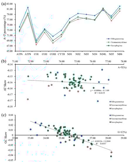 Nucleotide composition analysis of mitochondrial genomes from three subfamilies of Sarcophagidae: A + T percentage of the 13 protein-coding genes (a) and the corrections between A + T% vs. AT skew (b) and G + C% vs. GC skew (c) in the 13 protein-coding genes.
