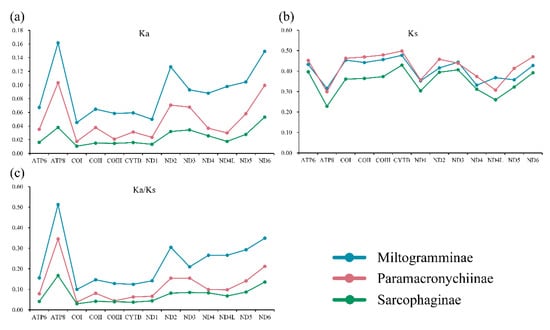 Synonymous (Ka; (a)) and nonsynonymous (Ks; (b)) substitutional rates and the Ka/Ks ratios (c) of the 13 protein-coding genes of the three subfamilies of Sarcophagidae.