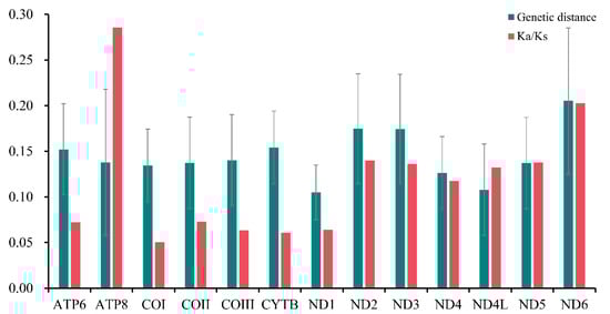 Ratios of nonsynonymous and synonymous substitution (Ka/Ks) and genetic distances of the 13 protein-coding genes of Sarcophagidae. Error bars refer to the standard deviation from all the combined data of all Sarcophagidae.