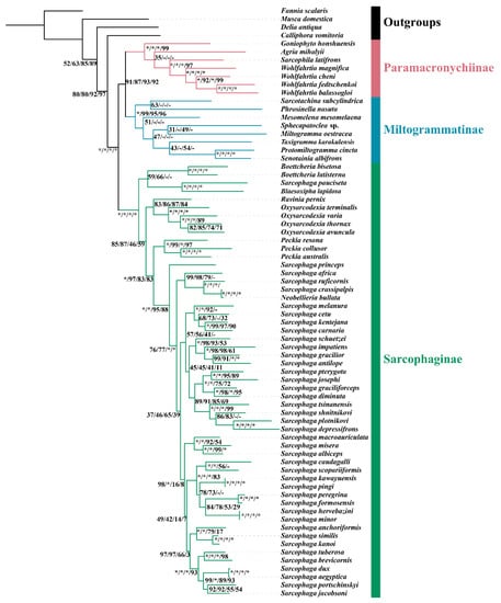 Phylogenetic analyses using the four datasets yielded similar topologies (Figure 5 and Figure S4–S7). The monophyly of Sarcophagidae received maximum support by all reconstructions. All three subfamilies were supported as monophyletic, and their relationship was consistently inferred as (Sarcophaginae, (Paramacronychiinae + Miltogramminae)) (BSs = 95–100; Figure 5 and Figure S4–S7). These results are in agreement with recent phylogenetic studies based on molecular data [,,,] but conflict with the older hypothesis based on morphology, which supports a sister-group relationship between Paramacronychiinae and Sarcophaginae [,].