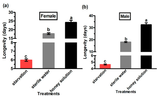 Longevity of female (a) and male (b) Grapholita molesta adults under different feeding treatments. The data are shown as the mean ± standard error. The different letters above the error bars indicate significant differences among the treatments (ANOVA: HSD test, p < 0.05).