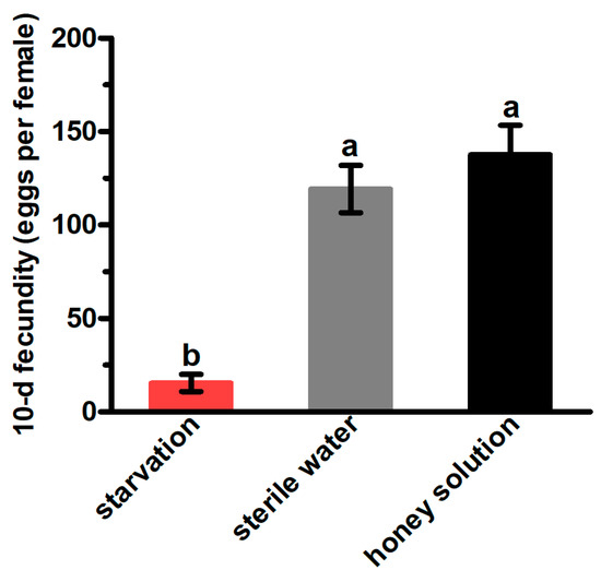 The 10-d fecundity of mated Grapholita molesta females under different feeding treatments. The data are shown as the mean ± standard error. The different letters above the error bars indicate significant differences between the treatments (ANOVA: HSD test, p < 0.05).