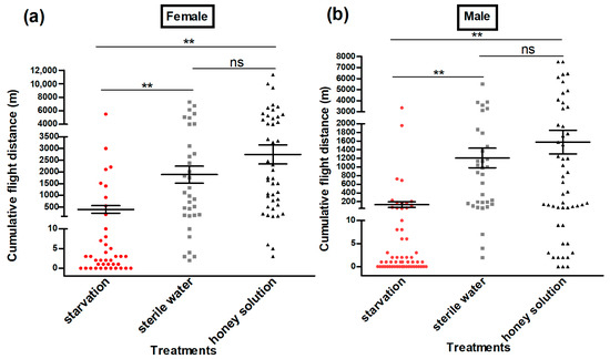 Cumulative flight distance (m) of female (a) and male (b) Grapholita molesta moths under different feeding treatments. The data are shown as the mean ± standard error. **, significant difference at p < 0.01; ns, means no significant difference.