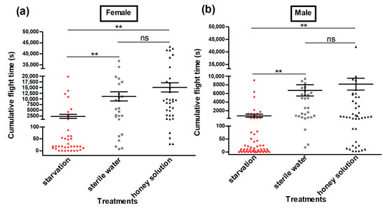 Cumulative flight time (s) of female (a) and male (b) Grapholita molesta moths under different feeding treatments. The data are shown as the mean ± standard error. **, significant difference at p < 0.01; ns, no significant difference.