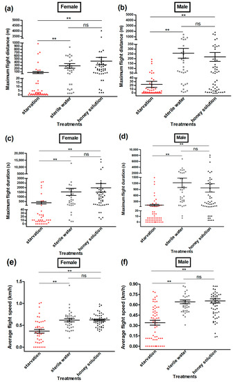 The maximum flight distance (m) (a,b), maximum flight duration (s) (c,d), and average flight speed (km/h) (e,f) of female and male Grapholita molesta moths under different feeding treatments. The data are shown as the mean ± standard error. **, significant difference at p < 0.01; ns, no significant difference.