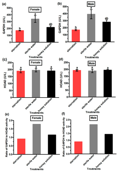 The activity of the GAPDH enzyme in the male and female adults from the sterile water treatment was significantly higher than in the starvation group (Figure 6a,b). However, the activity of the HOAD enzyme in female moths (F2,6 = 0.06, p = 0.94) and male moths (F2,6 = 7.06, p = 0.86) was not significantly different for the two treatments and the control group (Figure 6c,d). The ratio of GAPDH to HOAD activity in male and female adults was the highest for the sterile water treatment group and the lowest for the starvation group (Figure 6e,f). Moreover, the ratio of GAPDH to HOAD activity in the male and female adults was greater than 1 for the honey solution and the sterile water treatments, but lower than 1 for the starvation group.