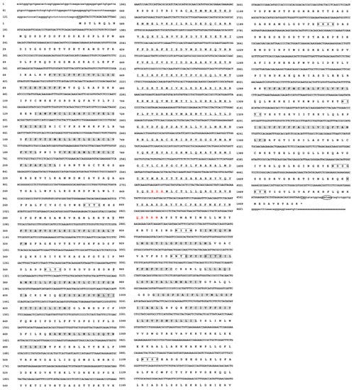 Nucleotide and deduced amino acid sequences of DcCHSA cDNA from D. citri. The start codon (ATG) and the stop codon (TAA) are indicated with black underlines, and the putative polyadenylation signal (AATAAA) in bold with a black ellipse. The 15 hydrophilic, membrane-spanning helices are indicated in gray font, the amino acid sequence of the putative catalytic domains is wavy-lined, and the chitin synthase signature motifs EDR (852–854 bp) and QRRRW (889–894 bp) are indicated in red font. Black boxes are used to indicate the 11 predicted N-glycosylation sites.