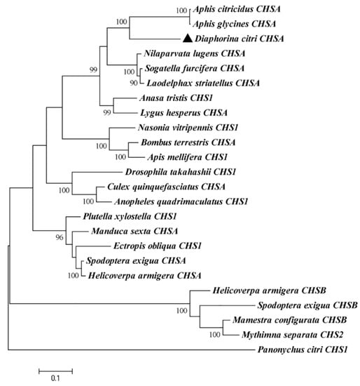 During growth and development, insects, such as D. citri, must molt on a regular basis and replace their stiff exoskeleton []. The cuticle of insects’ exoskeleton is vital to their survival because it can provide strength, defend against enemies, and prevent water loss []. Most of the cuticles of insects are made of chitin []. Insect tissues and organs such as the peritrophic membrane, trachea, and epidermis all contain chitin []. Chitin synthase (CHS) and chitin-degrading enzymes are required for chitin synthesis []. CHSA and CHSB are the two types of chitin synthase found in most insects (also called CHS1 and CHS2) []. Class A enzymes produce chitin in the epidermis, while class B enzymes are responsible for the synthesis of chitin in the intestinal epithelium []. Currently, only CHSA has been discovered in Hemiptera insects (Nilaparvata lugens and Aphis glycines) [,]. However, whether two chitin synthase genes exist in D. citri is one of the goals of this study. As with other Hemiptera insects, D. citri has only one CHS gene [].