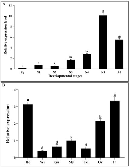 Relative expression levels of DcCHSA in different developmental stages and tissues of D. citri. (A) The expression of DcCHSA was highest in fifth-instar nymphs, followed by the adult stage. (B) Tissue-specific analysis showed that the transcription level of DcCHSA was highest in the head and integument, and the second highest was in the ovary. Different letters on the bars of the histogram indicate significant difference in gene expression compared to the treatment with lowest expression at p value < 0.05 (ANOVA). Eg, egg; N1, first-instar nymph; N2, second-instar nymph; N3, third-instar nymph; N4, fourth-instar nymph; N5, fifth-instar nymph; Ad, adult; He, Head; Wi, Wing; Gu, guts; My, Mycetome; Te, Testis; Ov, Ovary; In, Integument.