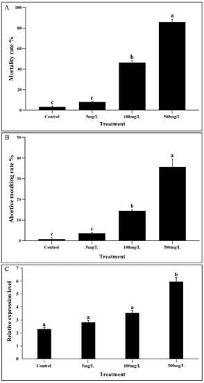 DFB was a prepared insecticide used in bioassays (Aladdin®, Aladdin Industrial Corporation, Ontario, CA, USA). We employed a modified leaf-dip bioassay that was based on a prior methodology []. As a stock solution, 150 mg of diflubenzuron was weighed, 150 mL of acetone was added, and 1 mg/mL of DFB solution was made. Then, five concentrations (5, 50, 100 mg/L, 200 mg/L, and 500 mg/L) were made with 0.01% surfactant Triton X-100 (Sangon Biotechnology, Shanghai, China). The control was treated with 0.01% surfactant Triton X-100. Isolated fresh leaves (M. exotica) were immersed in DFB solution for 5 min and air-dried for 1 h before 30 5th-instar nymphs were transferred to each leaf. The test insects were maintained at 27 °C with a 14:10 (L:D) photoperiod in a climate-controlled environment. The parameters including the regression equation, median lethal concentration, and correlation coefficient were calculated by SPSS 24.0. According to the virulence equation, three concentrations (5, 100, and 500 mg/L) were selected to evaluate the effect of DFB on the 5th-instar nymphs. At 48 h after the DFB exposure, the number of deaths and molts were counted, and the mortality and abortion molting rates were calculated. The mortality statistics also included the individuals who died due to abortive molting. Dead and surviving individuals were also included in the abortive molting rates. Three replicates were used for each experiment.