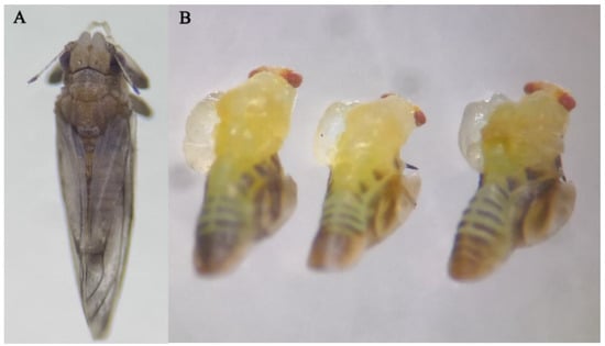 Exposed to 500 mg/L of DFB, D. citri nymphs showed a special phenotype. (A) The nymphs in the control (0.01% Triton X-100) can normally develop into adults. (B) Blisters appeared on the left front side of the nymph thorax in 500 mg/L of DFB.