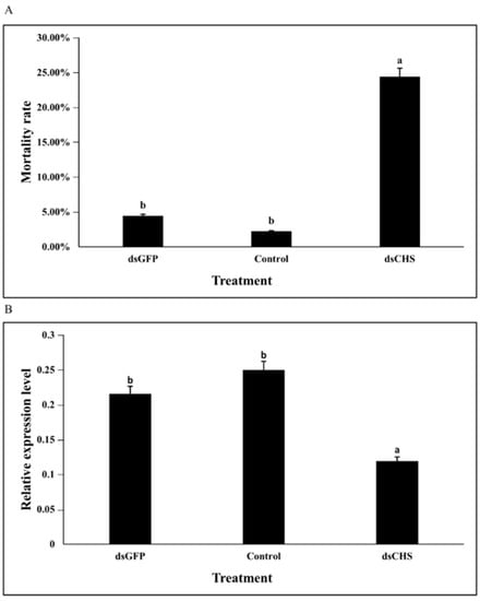 Effects on D. citri after RNAi of DcCHSA. (A) Cumulative mortality of D. citri in the treatment and control after RNAi of 48 h. After 48 h, the cumulative mortality of dsDcCHSA group was significantly higher than that of control group. (B) Relative expression levels of DcCHSA when D. citri was treated with dsDcCHSA and dsGFP. After feeding dsDcCHSA for 48 h, the transcript level of DcCHSA was significantly lower than that of the control group. Different letters on the bars of the histogram indicate significant difference at p value < 0.05 (ANOVA).