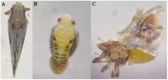 Fifth-instar nymphs treated with dsRNA. (A) Fifth-instar nymphs fed dsGFP can emerge normally. (B) After feeding dsRNA for 48 h, fifth-instar nymphs could not molt. (C) The freshly emerged adults failed to spread their wings, and the abdomen was unable to shed the old epidermis. A total of 30 fifth-instar nymphs were used for phenotypic observation after RNAi.