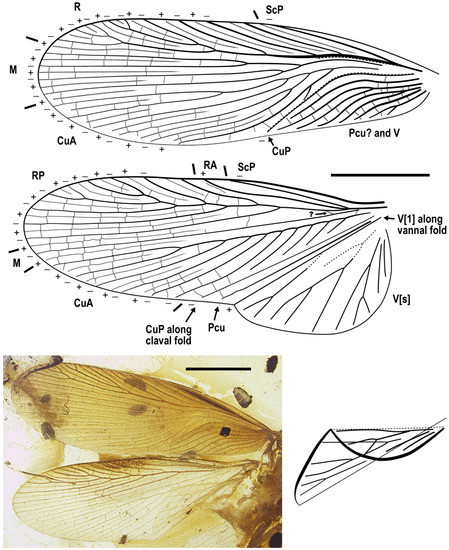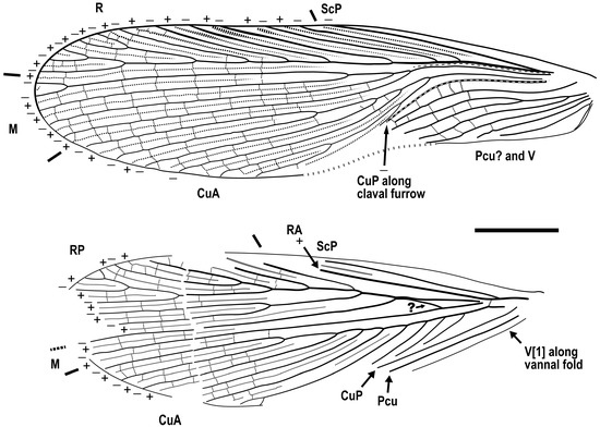 Abbreviations of wing veins. Posterior sector of Subcosta (ScP), Radius (R), anterior sector of Radius (RA), posterior sector of Radius (RP), Media (M), Cubitus (Cu), anterior sector of Cubitus (CuA), posterior sector of Cubitus (CuP), Postcubitus (Pcu), Vannal veins (V), anteriormost vannal vein along the vannal fold (V[1]), vannal veins that fill the vannus (V[s]).