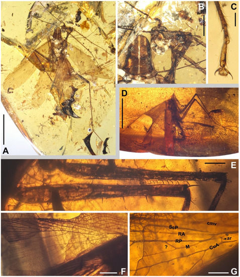 Manipulator modificaputis Vršanský and Bechly, 2015. (A–C) NIGP174199, sex unknown but probably male judging from its smaller size. (A) Dorsal view of the specimen. (B) Head and pronotum, dorsal view. (C) Hindtarsus and pretarsus. (D–G) NIGP174200, sex unknown. (D) lateral-dorsal view. (E) Right forefemur and midfemur. (F,G) Left hindwing with a close-up of the base, dorsal view; see the text for discussion about the question-marked vein. Abbreviations: ar, arculus; cmv, costo-marginal vein; other abbreviations of veins are explained in Materials and Methods. Scale bars: (A,D) = 5 mm, (B,F) = 1 mm, (C) = 200 µm, (E,G) = 500 µm.