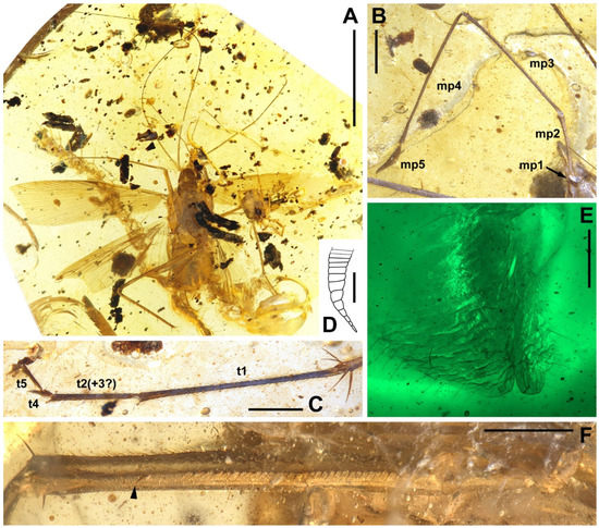 Manipulatoides obscura gen. & sp. nov., female allotype, NIGP174203. (A) Ventral view of the specimen. (B) Maxillary palpus. (C) Foretarsus. (D) Right cercus in ventral view. (E) Apex of seventh sternum (subgenital plate), note the valvation. (F) Right forefemur, with an arrowhead indicating a peculiar spine. Abbreviations: mp1–5, maxillary palpomeres I–V; t1–5, tarsomeres I–V. Scale bars: (A) = 5 mm, (B–D,F) = 500 µm, (E) = 200 µm.
