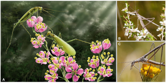 The long legs may function as brackets for stretching the body to stride across discrete spaces, and the long antennae and palpi as probes for detecting foods at a distance. Based on these modifications together, we speculate that Manipulatoridae feed on flower tissue (Figure 13A). Plant litter is the primary food source of most extant cockroaches [26,27], it is so readily accessible that these detritivorous cockroaches do not require a powerful sense organ to forage. Flower as a food source is far different from the plant litter: flowers are food islands amid branches and twigs, they are far separated, and detecting flowers requires powerful sense organs. The modifications of Manipulatoridae can be useful in such cases: the long antennae are helpful for detecting a distant food source, the well-developed wings support frequent long-distance movement, and the long legs are used to stride over the gaps or barriers on plant surfaces. With the long legs, Manipulatoridae can efficiently travel from one branch to another without walking through the entire branches, or from one leaf to another without climbing over both sides of a leaf. Some protective structure of plants, e.g., acanthae, can be readily overcame. Then Manipulatoridae stretch the long maxillary palpi into the corolla to verify the food, probably via nectar. Finally, these cockroaches may enjoy the feast when the plant is recognized. Occasional herbivory was reported from a variety of extant cockroaches [26,27], which are essentially in the typical morphotype of most cockroaches. This implies that occasional herbivory may not require adaptive modifications to morphotype. In other words, the morphotype of Manipulatoridae may not be adequately accounted for by occasional herbivory. The advantage of long-appendaged morphotype may be great energy save when foraging for flowers. Comparable morphotype is found in extant Zaprochilinae of Orthoptera, which are obligate pollen- and nectar-feeders (Figure 13B,C) [55,56]. Zaprochilinae share many morphological adaptations with Manipulatoridae: long and agile body, nimble head, narrow saddle-like pronotum, and elongate legs. The maxillary palpi of Zaprochilinae are not that long as that of Manipulatoridae, but still remarkable. Manipulatoridae occurred during the radiation of angiosperm, which provided new niches and allowed the co-radiation of flower-related organisms. Judging from the shape and size, some flowers from the Myanmar amber might be the host plants of Manipulatoridae (e.g., [57,58]).