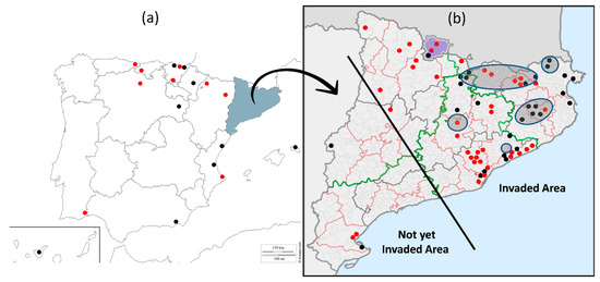 Localities of (a) the Iberian Peninsula and Canary and Balearic islands (except Catalonia) and (b) Catalonia and Andorra (in purple) where H. axyridis was recorded in spring or summer. Black and red points correspond to records before and after 2015, respectively. Grey ovals indicate the areas were overwintering aggregations have been found. The straight black line separates the updated hypothetical invaded area from the not yet invaded area within Catalonia.